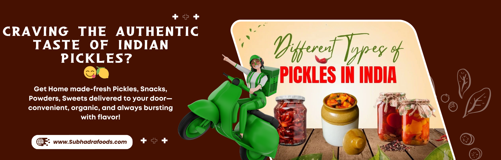 Welcome to Subhadra Foods — celebrating the soul of South Indian taste. At Subhadra Foods, we believe great food begins with tradition. Our collection of pickles, masalas, snacks, and handmade powders reflects the timeless flavors of South India, prepared with fresh ingredients and age-old recipes passed down through generations. Every jar and packet captures the wholesome, homely taste that brings families together.
